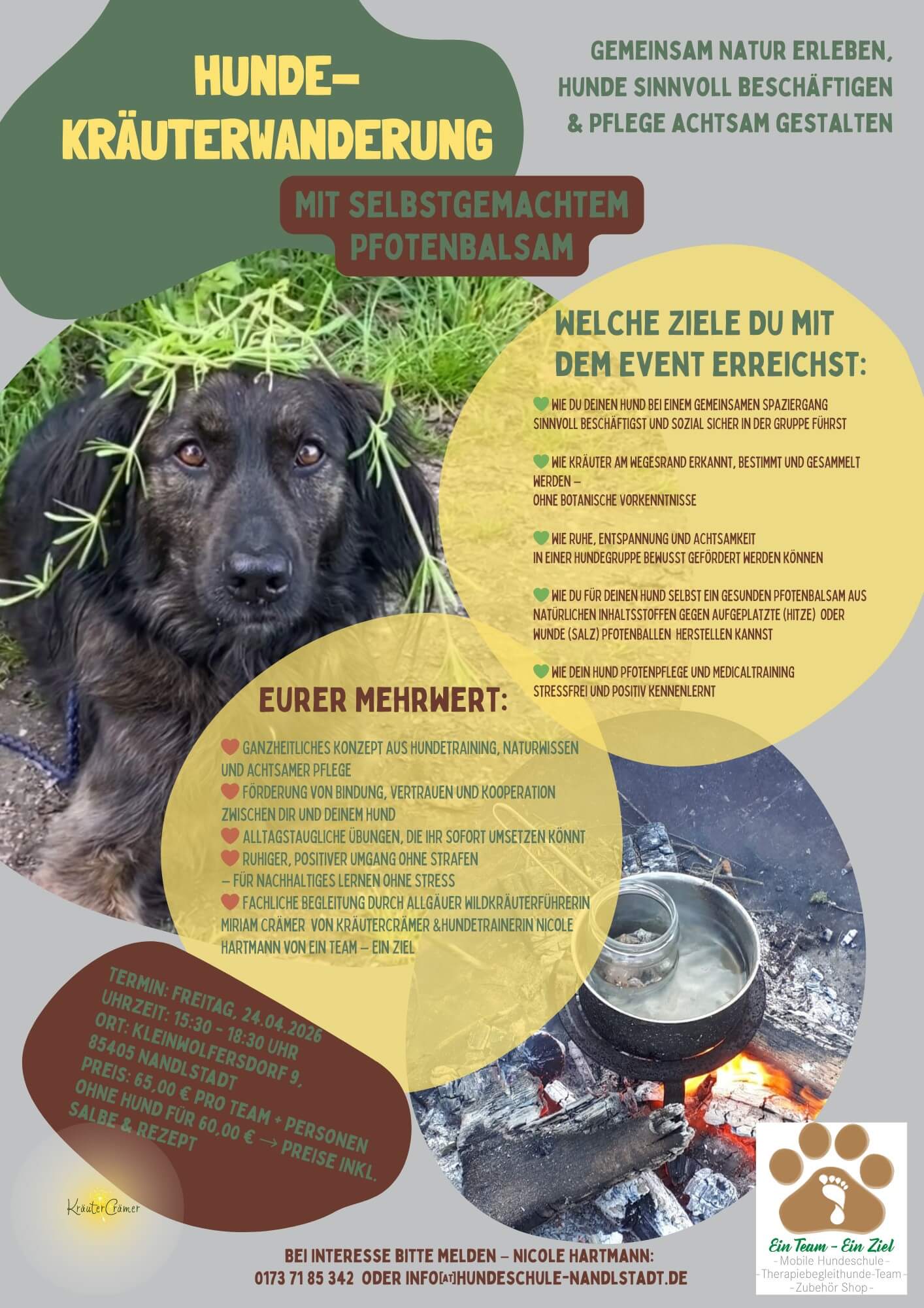 Begleitet von der erfahrenen Wildkräuterführerin Miriam Crämer und Hundetrainerin Nicole Hartmann lernst du heimische Pflanzen kennen und erfährst, wie Mensch und Hund entspannt und aufmerksam durch die Natur gehen können.